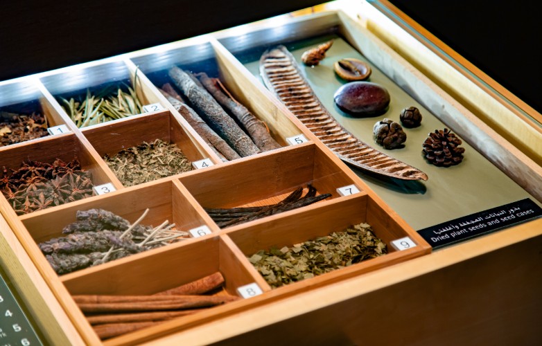 This display explores the wide variety of leaves, stems, roots, corms and flowers that were used by early Muslim herbalists to develop herbal medications.