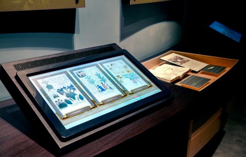 Examples of early books by Muslim scholars on botany and pharmacy are displayed.