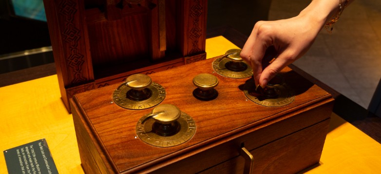 In addition to his iconic water clocks, al-Jazari made many, small useful devices for the Kings of Diyarbakr. This display shows his Combination Lock and Four-Bolt Door Lock.