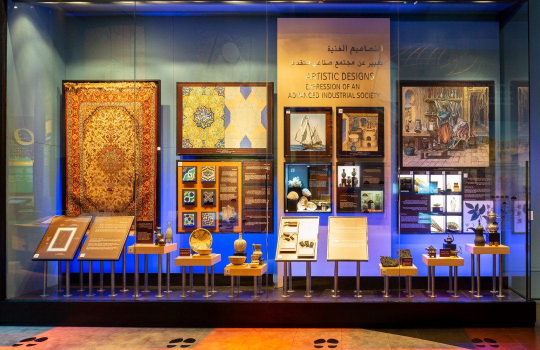 This large cabinet displays materials that were traded and products that were produced by early Muslim technologists, including carpets, ceramics, tiles, geometric designs, pearls, perfumes, henna, wooden printing blocks, oil lamps and coffee kettles.